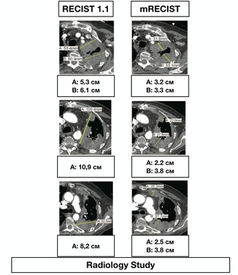 Слева представлены разница измерений при оценке ответа на проведённую терапию, используя критерии RECIST 1,1 и mRECIST для злокачественной мезотелиомы плевры.