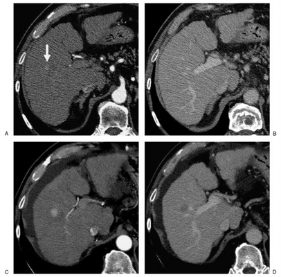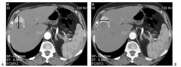 Применение mRECIST при оценке гепатоцеллюлярной карциномы. Оценка таргетного очага применительно только в артериальную фазу при компьютерной томографии (КТ). Согласно критериям RECIST идет подсчет суммы диаметров очагов. В дополнение согласно критериям mREСIST длинник очага оценивается в той части, что наиболее усилилась постконтрастно в артериальную фазу.
