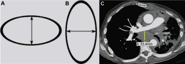 Соответствено, согласно RECIST общий размер к двум длинникам нужно прибавить короткое измерение лимфатического узла, тогда общий размер составит (10.9 + 8.2 = 19.1 см) + 3.3 см = 22.4 см,