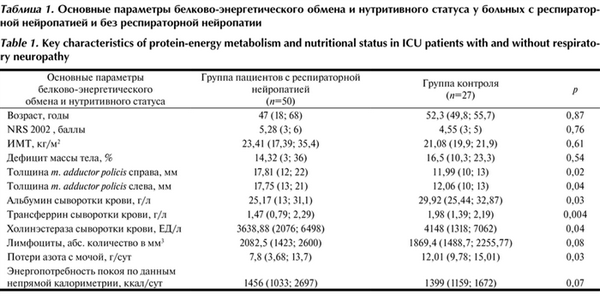 Таблица 1. Основные параметры белково-энергетического обмена и нутритивного статуса у больных с респираторной нейропатией и без респираторной нейропатии