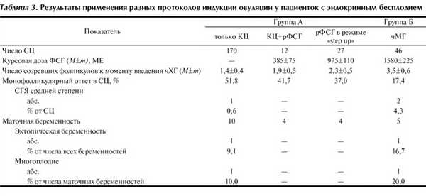 При сопоставлении результатов лечения с применявшимися протоколами контролируемой стимуляции учитывали частоту наступления маточной беременности (ЧНБ), параметры индуцируемого фолликулогенеза (среднее число созревающих фолликулов и % монофолликулярного ответа), среднюю курсовую дозу ФСГ (в протоколах с применением ГТ), частоту развития синдрома гиперстимуляции яичников (СГЯ), эктопической беременности (ЭБ) и многоплодия.