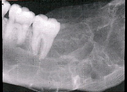 Периапикальная цементная дисплазия представлена диффузными деструктивными изменениями в виде чередования участков уплотнения (по плотности приближаются к плотности зуба), связанных непосредственно с корнями зубов, которые не имеют периодонтальной щели.