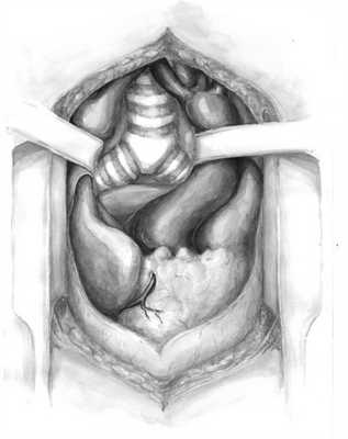 Аортокавальный промежуток (пространство Амбруцини) (рисунок Е.А. Воробьевой). Центральную культю главного бронха дополнительно укрепляли отдельными узловыми швами. При наличии факторов риска несостоятельности культи бронха формировали мышечный лоскут на питающей ножке из медиальной порции правой большой грудной мышцы, которым дополнительно укрепляли окклюзированную культю главного бронха. При левосторонней локализации мобилизацию осуществляли по левой стенке трахеи до бифуркации последней с диссекцией и мобилизацией дуги аорты и левого предсердия.