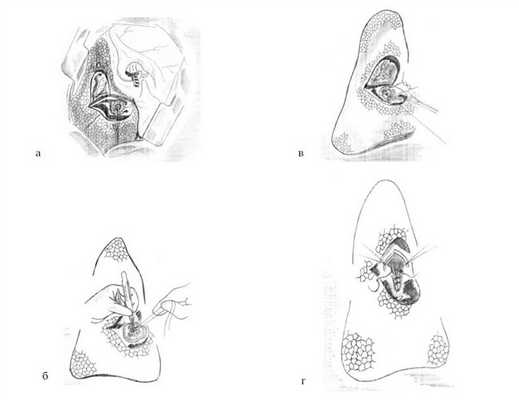 Способ заключается в следующем. После пункции кисты и отсасывания жидкости вскрывали фиброзную капсулу, удаляли хитиновую оболочку и остаточную полость обрабатывали 96% спиртом. Фиброзную капсулу, не покрытую легочной тканью, иссекали на всем протяжении до границы со здоровой легочной тканью. Об имеющихся бронхиальных свищах большого размера судили по наличию шума, появляющегося при повышении давления в системе дыхательного аппарата и соответственно в бронхах. Выявленные бронхиальные свищи ушивали кисетным швом, в качестве шовного материала использовали капрон 5/00 на атравматической игле (см. рисунок, а). Рисунок 1. Этапы ушивания бронхиальных свищей при первичной операции (схемы). а - ушивание бронхиального свища кисетным швом; б - освобождение края фиброзной капсулы; в - ушивание краев фиброзной капсулы Z-образным швом; г - мобилизация наружных листков фиброзной капсулы и ее ушивание узловыми швами. После этого, отступив 3-4 мм от кисетного шва, производили полулунные разрезы вокруг него, благодаря чему освобождали края фиброзной капсулы (см. рисунок, б). Освобожденные края фиброзной капсулы с двух сторон ушивали одним Z-образным швом над кисетным (см. рисунок, в). Наружные листки фиброзной капсулы несколько мобилизовывали от окружающих тканей, после чего свободно сшивали узловыми швами (см. рисунок, г).