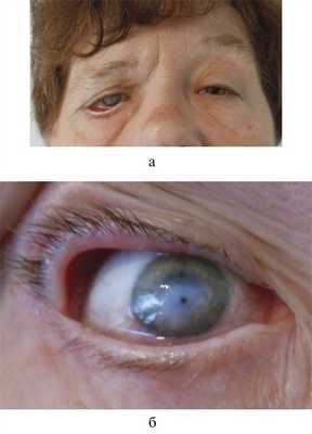 Рис. 1. Исходное состояние пациентки М. 63 лет при обращении. а — внешний вид до операции; б — васкуляризованное бельмо роговицы с центральной фистулой, тампонированной радужкой.