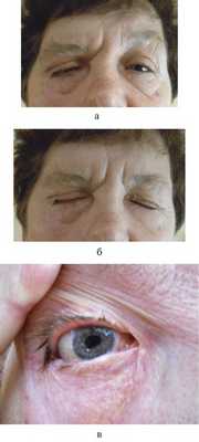 Рис. 3. Состояние после хемоденервации леватора верхнего века (через 1,5 мес), сквозной кератопластики и имплантации интраокулярной линзы справа (на 15-й день). а — вид пациентки при взгляде прямо, верхнее веко правого глаза опущено до середины зрачка, нижнее веко плотно адаптировано к глазу; б — вид пациентки с закрытыми глазами, смыкание правого глаза полное, лагофтальма нет; в — роговичный трансплантат прозрачный, швы адаптированы.
