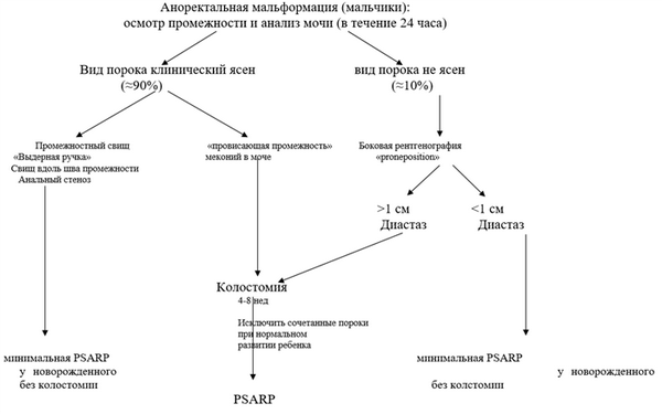 • Физикальное исследование в первые часы после рождения устанавливает вид атрезии и её высоту •• Прикрытое анальное отверстие — наиболее лёгкая форма низкой атрезии. На месте заднепроходного отверстия выявляют полупрозрачную мембрану, через которую просвечивает заполненная меконием прямая кишка •• Атрезия анального канала: также относят к разряду низких. На месте заднепроходного отверстия обнаруживают незначительное вдавление пигментированного участка кожи. При надавливании на него ощущают баллотирование (низкое расположение прямой кишки) •• Атрезия анального канала и прямой кишки: относят к высоким формам атрезий. Промежность обычно уменьшена в размерах, недоразвита. Нередко недоразвит или отсутствует копчик, иногда — крестец. На месте заднепроходного отверстия кожа чаще всего гладкая •• Атрезия прямой кишки (изолированная) может быть высокой и низкой. Заднепроходное отверстие с хорошо сформированным наружным сфинктером расположено на обычном месте. Для установления диагноза достаточно ввести катетер через заднепроходное отверстие или провести пальцевое исследование •• Свищ в половую систему бывает исключительно у девочек. Основной признак — выделение мекония, а затем кала и газов через половую щель •• Свищ в мочевую систему (мочевой пузырь, мочеиспускательный канал) возникает почти исключительно у мальчиков. Основной признак — отхождение мекония и газов через наружное отверстие мочеиспускательного канала. При расположении свища выше сфинктера мочевого пузыря меконий отходит только во время мочеиспускания (моча, окрашенная меконием) •• Клоакальная форма атрезии — наиболее сложный аноректальный порок развития. Во время осмотра обнаруживают отсутствие заднепроходного отверстия. На месте, где должны быть наружные отверстия мочеиспускательного канала или влагалища, находится одно отверстие — выход клоаки, в которую открываются мочеиспускательный канал, влагалище и прямая кишка. Анатомические формы клоаки многообразны, поэтому необходимо детальное обследование •• Свищ на промежность возникает у мальчиков и девочек. Диагностика основана на наружном осмотре — отхождение мекония и газов из «нетипичного места» •• Сочетанные пороки развития в разнообразных комбинациях (аплазия почки, мегауретер, гипоспадия, удвоение почки и мочеточника и др.) часто возникают при атрезиях заднего прохода и прямой кишки.