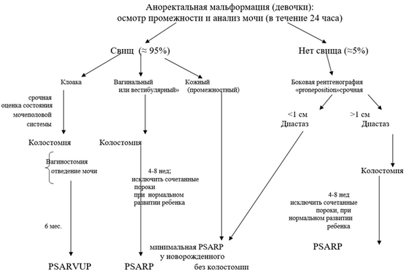 Классификация • Атрезии •• Клоакальная форма (у девочек)* ••• пузырная ••• вагинальная •• Со свищами ••• в мочевую систему у мальчиков (в мочевой пузырь и мочеиспускательный канал)* ••• в половую систему у девочек (матку*, влагалище*, преддверие влагалища) ••• на промежность у мальчиков и девочек (у мальчиков также на мошонку и половой член) •• Без свищей ••• атрезия заднего прохода и прямой кишки* ••• атрезия заднепроходного канала ••• прикрытое заднепроходное отверстие ••• атрезия прямой кишки при нормально развитом заднем проходе • Примечание. Звёздочкой (*) отмечены высокие формы атрезии (надлеваторные, слепой мешок прямой кишки расположен выше 2-2,5 см от кожи). Все остальные относят к низким (подлеваторные).