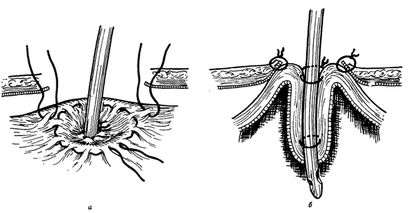 Для оперативного закрытия гастростомы в1—2смот отверстия свища и вокруг него производят окаймляющий разрез кожи. По линии этого разреза циркулярно рассекаются все слои брюшной стенки. Нужно следить за тем, чтобы скальпель был направлен перпендикулярно кожной поверхности и в глубине не подходил слишком близко и не удалялся слишком далеко от гастростомического канала. После рассечения мускулатуры брюшной стенки кожные края по сторонам от свища и перед свищом захватывают инструментами или сшивают несколькими швами. Тем самым предупреждают попадание в операционную рану через свищевой ход содержимого желудка.