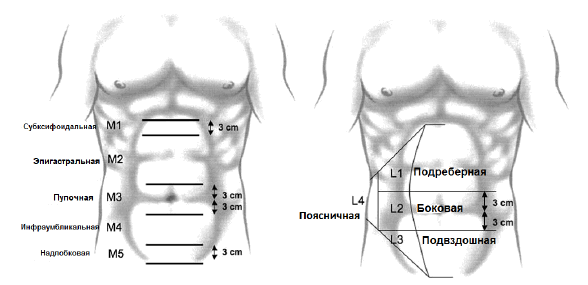 Срединная (M) грыжа включает 5 зон (W1-W5) (рис. 1): M1 - субксифоидальная (от мечевидного отростка до 3 см каудально), M2 - эпигастральная (от 3 см ниже мечевидного отростка до 3 см над пупком), M3 - пупочная (3 см выше и ниже пупка), M4 - инфраумбиликальная (от 3 см ниже пупка до 3 см над лобком), M5 - надлобковая (от лобковой кости до 3 см краниально). Латеральная (L) грыжа включает 4 зоны: L1 - подреберная (латеральнее прямой мышцы между реберной дугой и горизонтальной линией на 3 см выше пупка) , L2 - боковая (латеральнее прямой мышцы между горизонтальной линией на 3 см ниже и выше пупка) L3 - подвздошная (латеральнее прямой мышцы между горизонтальной линией на 3 см ниже пупка и подвздошной области), L4 - поясничная (латеральнее передней подмышечной линии).