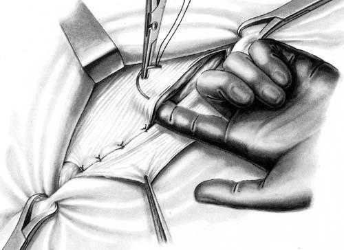 После обработки и удаления грыжевого мешка приступают к завершающему этапу операции - закрытию (пластике) грыжевых ворот.