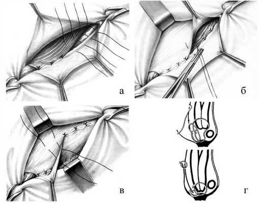 Рис. 21. Пластика передней стенки пахового канала по Жирару. а - подшивание краев внутренней косой и поперечной мышц живота к паховой связке; б - подшивание верхнего лоскута апоневроза наружной косой мышцы живота к паховой связке; в - создание дубликатуры апоневроза; г - схема.