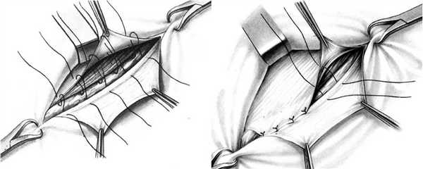 Низведение мышц для уменьшения пахового промежутка облегчается при проведении послабляющих разрезов передней стенки влагалища прямой мышцы живота. К ним приходится прибегать, если высота промежутка превышает 3 см и при наложении швов возникает большое напряжение.