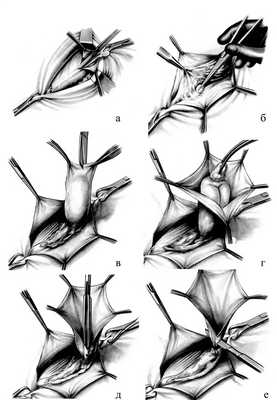 Рис. 20. Этапы грыжесечения при паховой грыже. а - рассечение грыжевых ворот; б - выделение грыжевого мешка; в - вскрытие грыжевого мешка; г - ревизия содержимого грыжевого мешка; д - погружение содержимого в брюшную полость с прошиванием шейки; е - отсечение грыжевого мешка.