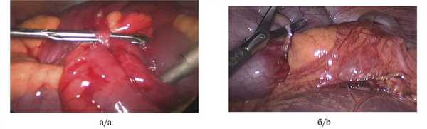 В отсроченном порядке оперированы 10 (22,3%) больных. Показаниями явились рецидивирующее течение спаечной болезни от 2 до 6 раз в течение года и «малые» операции (гинекологические операции, холецистэктомия, аппендэктомия, грыжесечение) в анамнезе. Признаком адекватности проведенного адгезиолизиса было заполнение газом и кишечным содержимым дистальных отделов желудочно-кишечного тракта (рис. 3). Рис. 3. Интраоперационная картина лапароскопического адгезиолизиса (изображение при эндоскопии). а — единичный штранг, выявленный при лапароскопии, который является причиной спаечной тонкокишечной непроходимости; б — рассечение штранга, восстановление пассажа по кишечнику, устранение тонкокишечной непроходимости. a — a single adhesion diagnosed during laparoscopy which resulted adhesive small bowel obstruction; b — intersection of adhesion, restoration of passage through small bowel, elimination of small bowel obstruction.
