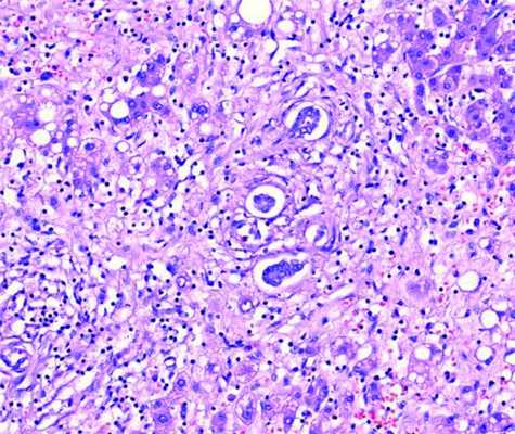 При микроскопическом исследовании опухоль представлена полями фибробластов и миофибробластов с участками миксоматоза и некроза, а также хронической воспалительной инфильтрацией в виде лимфоидных фолликулов и плазмоцитов. Печеночная ткань в виде остаточных островков среди веретенообразных и звездчатых клеток со светлыми ядрами, содержащими единичные маленькие ядрышки, со светлой амфифильной цитоплазмой и нечеткими клеточными границами (рис. 8). Рисунок 8. Печеночная ткань в виде остаточных островков среди веретенообразных и звездчатых клеток со светлыми ядрами. Окрашивание гематоксилином и эозином. Желчные протоки атрофированы, деформированные, окруженные миксоматозной фибропластической стромой. Воспалительная инфильтрация носит неравномерный характер. Между сформированными лимфоидными фолликулами, часть из которых со светлыми зародышевыми центрами, отмечается скудная лимфоцитарная, плазмоцитарная и моноцитарная инфильтрация, рассеянная в миксоматозной строме. Среди фибробластов отмечаются крупные звездчатые клетки с гиперхромными атипичными ядрами и просматривающимся ядрышками.