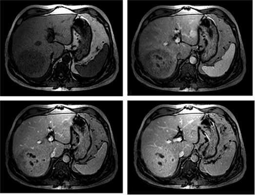 При контрастном усилении отмечено накопление контрастного вещества в артериальную фазу центробежно, с наибольшей локализацией контрастного агента в центральной части (рис. 3). Рисунок 3. Магнитно-резонансная томограмма с контрастированием (нативное исследование, 15 с - артериальная фаза, 60 с - венозная фаза, более 4,5 мин - отсроченная фаза). К отсроченной фазе образование набирает контрастный препарат всем объемом, довольно гомогенно и по отношению к паренхиме печени - слабогиперинтенсивно. При этом в центральной части свободными от контрастного средства во все фазы исследования остаются жидкостные участки.
