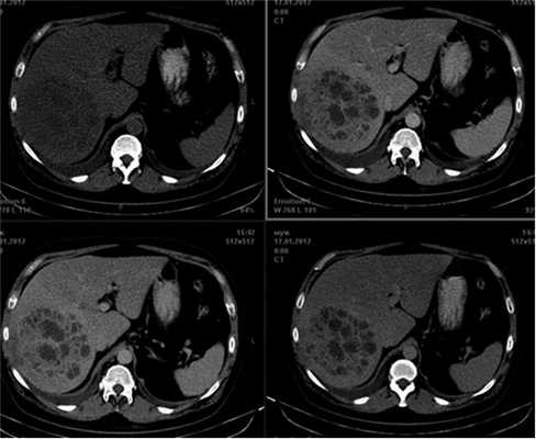 Пациент К., 48 лет, заболел остро в начале января 2012 г., когда появилась лихорадка до 39 °С. Госпитализирован в инфекционное отделение городской больницы по месту жительства с диагнозом острая респираторная вирусная инфекция, там же появилась желтушность кожных покровов. После исключения вирусного гепатита переведен в хирургическое отделение. При ультразвуковом исследовании (УЗИ) выявлено образование правой доли печени 12×14 см. Опухолевые маркеры: альфафетопротеин - 1,99 ЕД/мл (норма), СА19-9 -