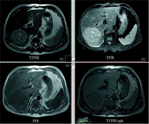 В VI-VII сегментах печени определяется объемное образование с нечеткими, волнистыми контурами, неоднородной структуры, в центре имеются неправильной формы участки с жидкостными характеристиками. Окружающая паренхима с признаками инфильтративных изменений. По верхнему контуру образования прослеживается дугообразно деформированная ветвь правой печеночной вены, по переднему контуру - смещенная ветвь средней печеночной вены (рис. 2). Рисунок 2. Магнитно-резонансная томограмма органов брюшной полости без контрастного усиления. В правой доле печени — опухолевый узел округлой формы гетерогенной структуры с неровными контурами. Наиболее отчетливо визуализируется в импульсной последовательности STIR.