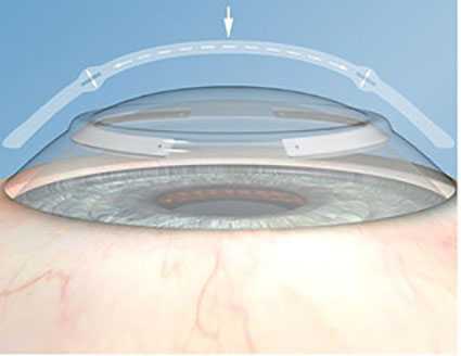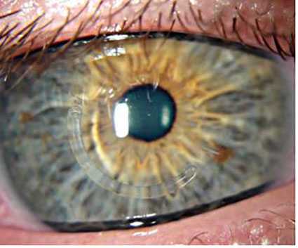 Предварительно в роговице формируются роговичный туннель, через который вводятся роговичный сегмент, что приводит к уплощению центральной зоны роговицы. Не маловажным аспектом этой операции являеться ее реверсивность -т.е. возможность замены или удаления сегмента, если зрение изменится с возрастом. Это возможно потому, что не повреждается центр роговицы и не удаляется роговичная ткань. На следующий день после операции глаз пациента абсолютно спокоен и после непродолжительной реабилитации пациент может преступать к повседневным зрительным нагрузкам (рис. 4 Следует отметить, что имплантация интрастромальных сегментом не влияет на косметику больного и позволяет ему пользоваться мягкими контактными линзами. В зависимости от показаний возможна комбинация кросслинкинга и интростромальной имплантации роговичных сегментов.