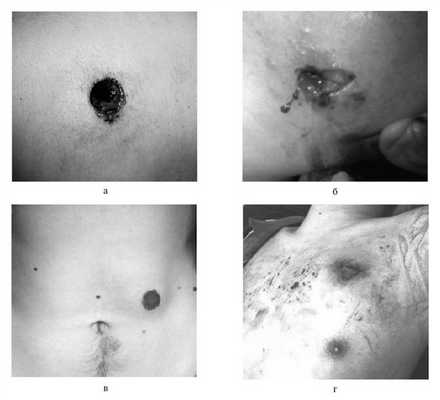 Внешний вид ран, нанесенных пулями из этих двух типов травматического оружия, также был различен. Если раны, нанесенные пулями из пистолета типа «Макарыч», были в основном округлой формы, от 0,9 до 1,5 см в диаметре с относительно ровными краями (рис. 3, а), Рисунок 3. Внешний вид ран, нанесенных травматическим оружием. Объяснения в тексте. то ранения пулями, выпущенными из «Осы», имели рваные края с большой зоной ушиба, диаметр их колебался от 2 до 3 см (рис. 3, б). При выстрелах с дальнего расстояния пули калибра как 9 мм, так и 18 мм причиняли поверхностные повреждения, которые были представлены зоной осаднения кожи, ушиба и подкожным кровоизлиянием (рис. 3, в, г).