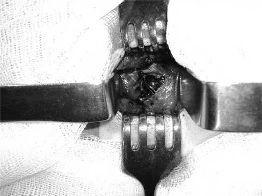 Через 15 мин после поступления больной был оперирован. Под местной анестезией выполнено дренирование правой плевральной полости, получено около 500 мл свежей крови, после чего отделение крови прекратилось, однако продолжалось поступление воздуха. Операция завершена первичной хирургической обработкой раны: при ревизии раневой канал в четвертом межреберье проникал в правую плевральную полость.
