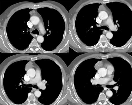 При гиперплазии вилочковой железы форма железы не изменена, может быть двудольчатой или состоять из отдельных участков тимической ткани. Контур тимуса выпуклый, увеличена толщина. После контрастного усиления в отсроченную фазу отчетливо видна однородно накапливающая контраст гиперплазированная ткань тимуса.
