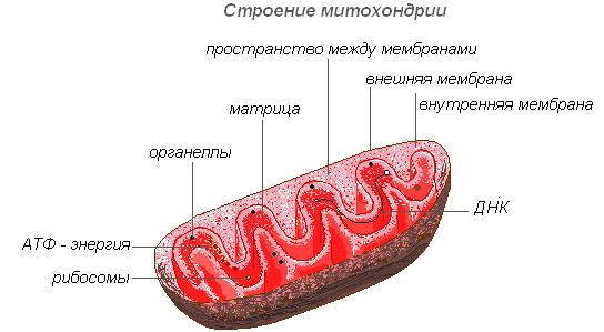 Митохондрии имеют двухмембранное строение. Внешняя мембрана гладкая, внутренняя образует различной формы выросты — трубочки в растительных клетках. Пространство внутри митохондрии заполнено полужидким содержимым (матриксом), куда входят ферменты, белки, липиды, соли кальция и магния, витамины, а также РНК, ДНК и рибосомы. Ферментативный комплекс митохондрий ускоряет работу сложного и взаимосвязанного механизма биохимических реакций, в результате которых образуется АТФ. В этих органеллах осуществляется обеспечение клеток энергией — преобразование энергии химических связей питательных веществ в макроэргиеские связи АТФ в процессе клеточного дыхания. Именно в митохондриях происходит ферментативное расщепление углеводов, жирных кислот, аминокислот с освобождением энергии и последующим превращением её в энергию АТФ. Накопленная энергия расходуется на ростовые процессы, на новые синтезы и т. д. Митохондрии размножаются делением и живут около 10 дней, после чего подвергаются разрушению.