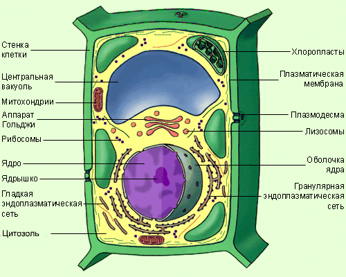 В растительной клетке есть ядро и все органоиды, свойственные животной клетке: эндоплазматическая сеть, рибосомы, митохондрии, аппарат Гольджи. Вместе с тем она отличается от животной клетки следующими особенностями строения: