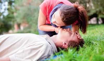 - При отсутствии реакции - прощупать пульсовые колебания сонной артерии (под углом нижней челюсти), оценить наличие самостоятельных дыхательных движений - посмотреть, есть ли экскурсия грудной клетки, послушать ухом звук выдыхаемого воздуха или почувствовать выдыхаемый воздух своей щекой (алгоритм “посмотри, послушай, почувствуй”).