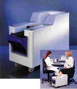 Системы DXA являются наиболее изученными и широко применяются в клинической практике (рис. 2). DXA позволяет измерять МПК в центральных отделах скелета: в поясничном отделе позвоночника и в проксимальном отделе бедренной кости. В этих участках происходят наиболее тяжелые переломы. Кроме того, многие из этих приборов снабжены программой «все тело», позволяющей определить содержание минералов во всем скелете, а также исследовать мягкие ткани — мышечную и жировую. В новых модификациях приборов DXA имеется возможность латерального сканирования и морфометрического измерения позвонков,что значительно повышает информативность этого метода. Метод DXA также адаптирован для оценки состояния МПК в области периферических участков скелета, в частности в области предплечья и пяточной кости (рис. 3).