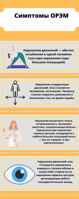 ОРЭМ может проявляться разными симптомами, в зависимости от того, какой отдел головного мозга поражен.