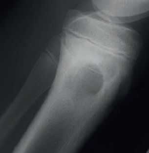 При рентгенологическом исследовании в типичном месте, чаще в метафизе длинной трубчатой кости, выявляются один или несколько очагов деструкции костной ткани с достаточно ровными и четкими контурами, ограниченные полоской склероза. При суб - или интракортикальной локализации очагов деструкции может отмечаться на ограниченном участке нежная периостальная реакция.