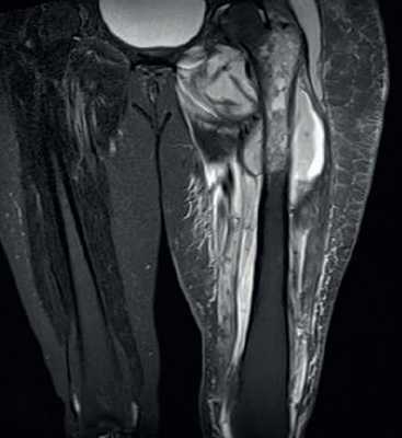 МРТ бедренной области. Остеомиелит бедренной кости с поражением мягких тканей с формированием абсцесса.