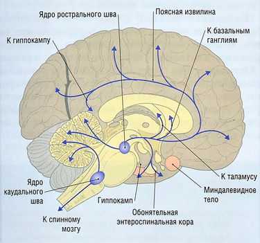 Наиболее изучены подтипы 5-НТ1А, 5-НТ2В, 5-НТ2с и 5-НТ3. Серотонинергические клеточные тельца в основном локализуются в области верхнего варолиевого моста и среднего мозга. Классические области для 5-НТ-содержащих нейронов — ядра медиального и дорсального шва. Нейроны от ядер шва идут к базальным ганглиям и различным частям лимбической системы и имеют широкое распределение по всей коре головного мозга в дополнение к связям с мозжечком (рис. 8.26).