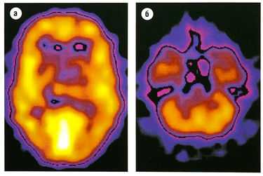 Рис. 8.25 Кортикальное распределение ГАМКд-рецепторных комплексов. Изображение получено с помощью радиоактивно меченного аналога бензодиазепина ломазенила и однофотонной эмиссионной компьютерной томографии. Самые светлые области имеют наивысшую плотность рецепторов, (а) Изображение на уровне среднезатылочной коры, (б) Изображение на уровне мозжечка.