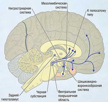 Рис. 8.28 Дофамин в центральной нервной системе. Дофаминергические тракты — нигростриарный, мезолимбический/мезокортикальный и шишковидно-воронкообразный.