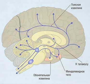 Рис. 8.27 Норэпинефрин в центральной нервной системе. Большая часть НЭ-содержащих нейронов в центральной нервной системе расположены в голубоватом пятне варолиевого моста и среднего мозга. Эти нейроны идут через связку средней части переднего мозга в лимбической системе к коре, таламусу и гипоталамусу. Вторая группа НЭ-содержащих нейронов в вентральной покрышечной области имеет отростки к гипоталамусу и миндалевидному телу.