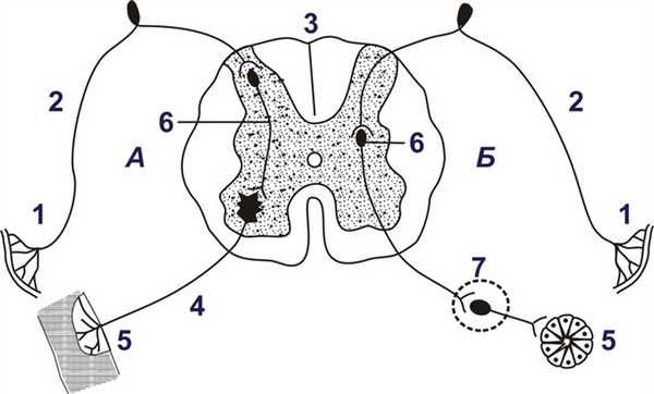 В простой вегетативной рефлекторной дуге, как и в соматической, выделяют три звена, а именно: 1) рецепторное, образованное чувствительным (афферентным) нейроном; 2) ассоциативное, представленное вставочным нейроном и 3) эффекторное звено, образованное двигательным (эфферентным) нейроном, передающим возбуждение на рабочий орган.