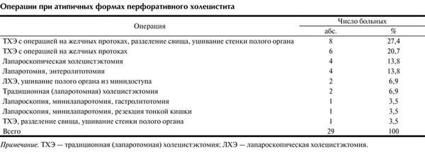Оперативные вмешательства и их результаты при атипичных формах перфоративного холецистита. Все больные с атипичными клиническими формами перфорации желчного пузыря были оперированы. Оперативные вмешательства отличаются крайним разнообразием (см. таблицу). Операции при атипичных формах перфоративного холецистита Примечание. ТХЭ — традиционная (лапаротомная) холецистэктомия; ЛХЭ — лапароскопическая холецистэктомия.