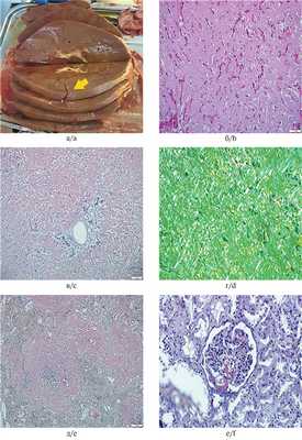 При микроскопическом исследовании в печени отмечено тотальное отложение амилоидных масс (зеленовато-окрашенных в поляризационном микроскопе), среди которых располагались отдельные сохранившиеся печеночные балки (см. рисунок, б, в, г). Типирование щелочным гуанидином показало, что амилоид относится к AL-типу. В селезенке амилоид выявлен как в фолликулах, так и в красной пульпе (см. рисунок, д). Амилоидные конго-положительные отложения обнаружены в строме, сосудах, клубочках почек (см. рисунок, е), что соответствует протеинурической стадии. Также небольшие участки амилоида определены по ходу сосудов и периваскулярно в надпочечниках и поджелудочной железе. В гипертрофированном миокарде выявлены жировая дистрофия кардиомиоцитов и диффузный мелкоочаговый кардиосклероз. В легких наряду с хроническими изменениями местами обнаружены мелкие обтурирующие тромбы и геморрагические инфаркты.