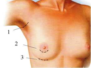 Протезирование молочных желез выполняется за счет размещения под тканью молочной железы или под грудной мышцей специального силиконового имплантата (эндопротеза). На сегодняшний день существует несколько способов доступа (места разреза): подмышечный (1), ареолярный (2), субмаммарный (3).