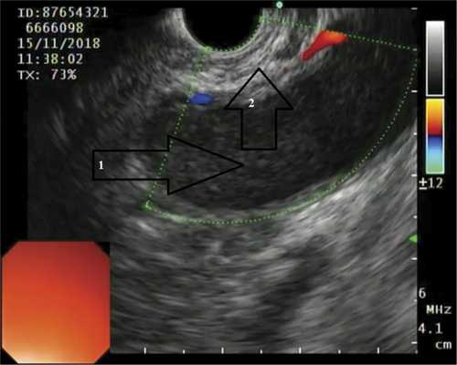 Контрольное УЗИ, выполненное перед выпиской, выявило отсутствие жидкостного образования у 18 (81,9%) пациентов, у 4 (18,2%) — уменьшение полости ПК более чем в 2 раза (рис. 3). Рис. 3. Стент в области головки поджелудочной железы, полость отсутствует, стрелками указаны края стента (изображение при ультразвуковом исследовании).