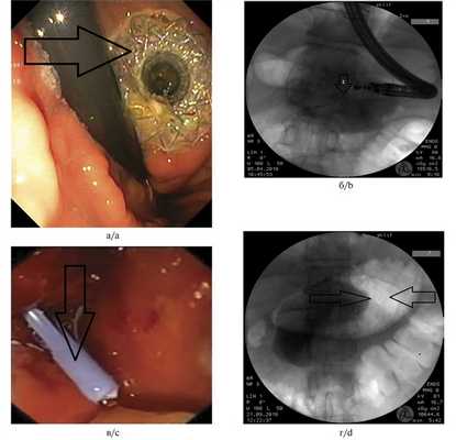 При наличии сформированной фиброзной капсулы и однородном жидкостном содержимом кисты выполняли установку пластиковых стентов. Отсутствие капсулы свидетельствует о наличии острого жидкостного скопления, которое нельзя дренировать через желудок. При выявлении секвестров, признаков инфицирования содержимого и в отсутствие капсулы при минимальной длине анастомоза (менее 1 см) устанавливали металлический саморасширяющийся стент.