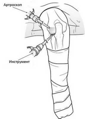 Слова «артроскопия» происходит от двух греческих слов: «артро» — сустав, и «скопео» — смотрю, и дословно означает «смотреть в сустав». Во время артроскопии локтевого сустава в него вводится небольшая камера, называемая артроскопом. Изображение с камеры передается на телеэкран, и под таким визуальным контролем хирург вводит в полость сустава миниатюрные хирургические инструменты, с помощью которых выполняет все необходимые манипуляции.