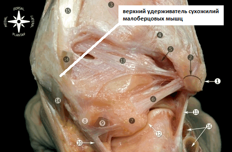 Сухожилие длинной малоберцовой мышцы располагается кзади от сухожилия короткой. Онипроходят в одном фиброзно-хрящевом канале, глубиной всего около 5 мм, отграниченные по задней поверхности верхним удерживателем малоберцовых мышц.