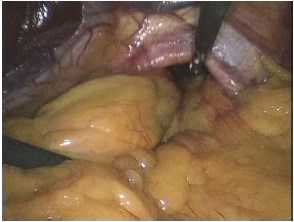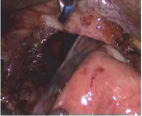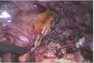 В начале операции с помощью электрохирургической техники выполнялось рассечение верхней части малого сальника и париетальной брюшины над правым и верхним краями ПОД с частичным выделением правой ножки и началом иссечения грыжевого мешка (рис. 2).