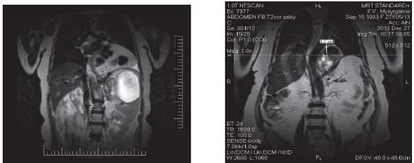 В нашем случае при площади грыжевого дефекта в диафрагме более 4 см 2 осуществлялась протезирующая диафрагмокруропластика. Перитонизация сетчатого протеза фрагментом грыжевого мешка, оставленного на передней стенке пищевода, позволяет избежать осложнений в послеоперационном периоде, связанных с взаимодействием органов брюшной полости и сетки, а именно: спаечного процесса в брюшной полости, эрозии стенки желудка, эрозии стенки тонкой кишки, миграции сетки в просвет пищевода или желудка.