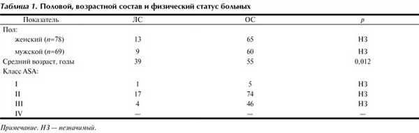 Физическое состояние больных перед операцией оценивалось по классификации ASA с I по IV (см. табл. 1). При использовании метода χ 2 эти данные статистически достоверно не различались в группах ЛС и ОС.