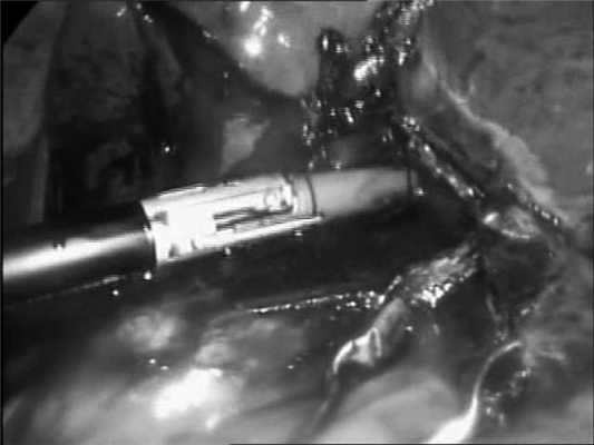 Далее визуализировалась поджелудочно-селезеночная связка с проходящими в ней артерией и веной, при этом хорошо определялись хвост поджелудочной железы и ворота селезенки. При выполнении первых двух операций ножку селезенки обрабатывали сшивающим аппаратом Endo GIA 60 (высота скрепки 2,5 мм) и с дополнительным наложением гемостатических Z-образных швов (см. рисунок, б). Рисунок 1. Этапы лапароскопической спленэктомии. б - пересечение ножки селезенки сшивающим аппаратом.